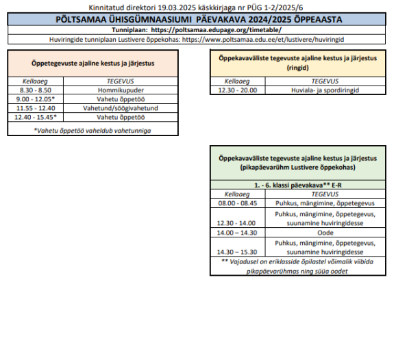 | PÕLTSAMAA ÜHISGÜMNAASIUMI PÄEVAKAVA 2024/2025 ÕPPEAASTA | |