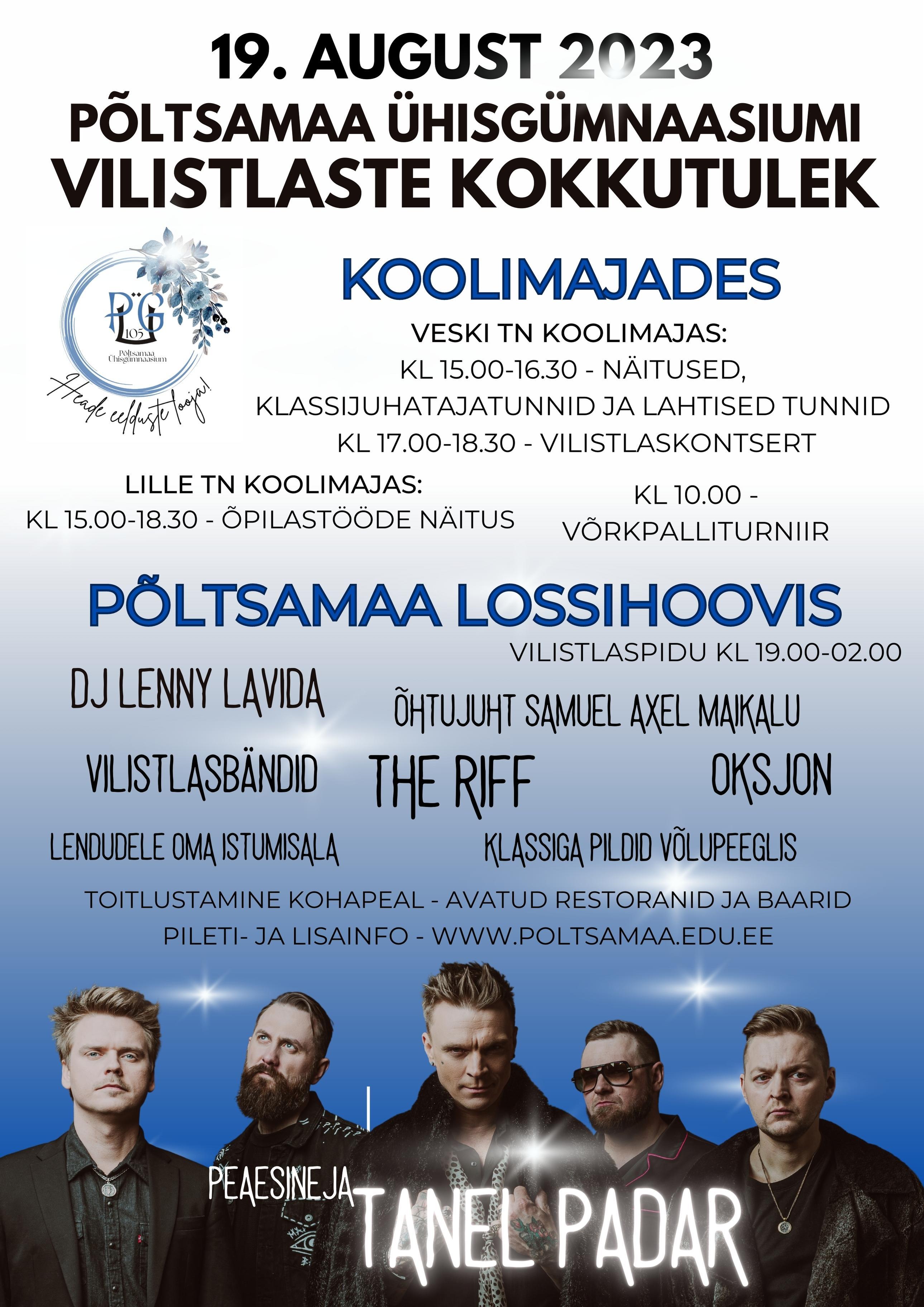 Õhtune Põltsamaa Ühisgümnaasiumi vilistlaspidu Põltsamaa lossihoovis toimub kell 19–2, lavale astuvad erinevad bändid. Vilistlaspeo peaesineja on Tanel Padar.