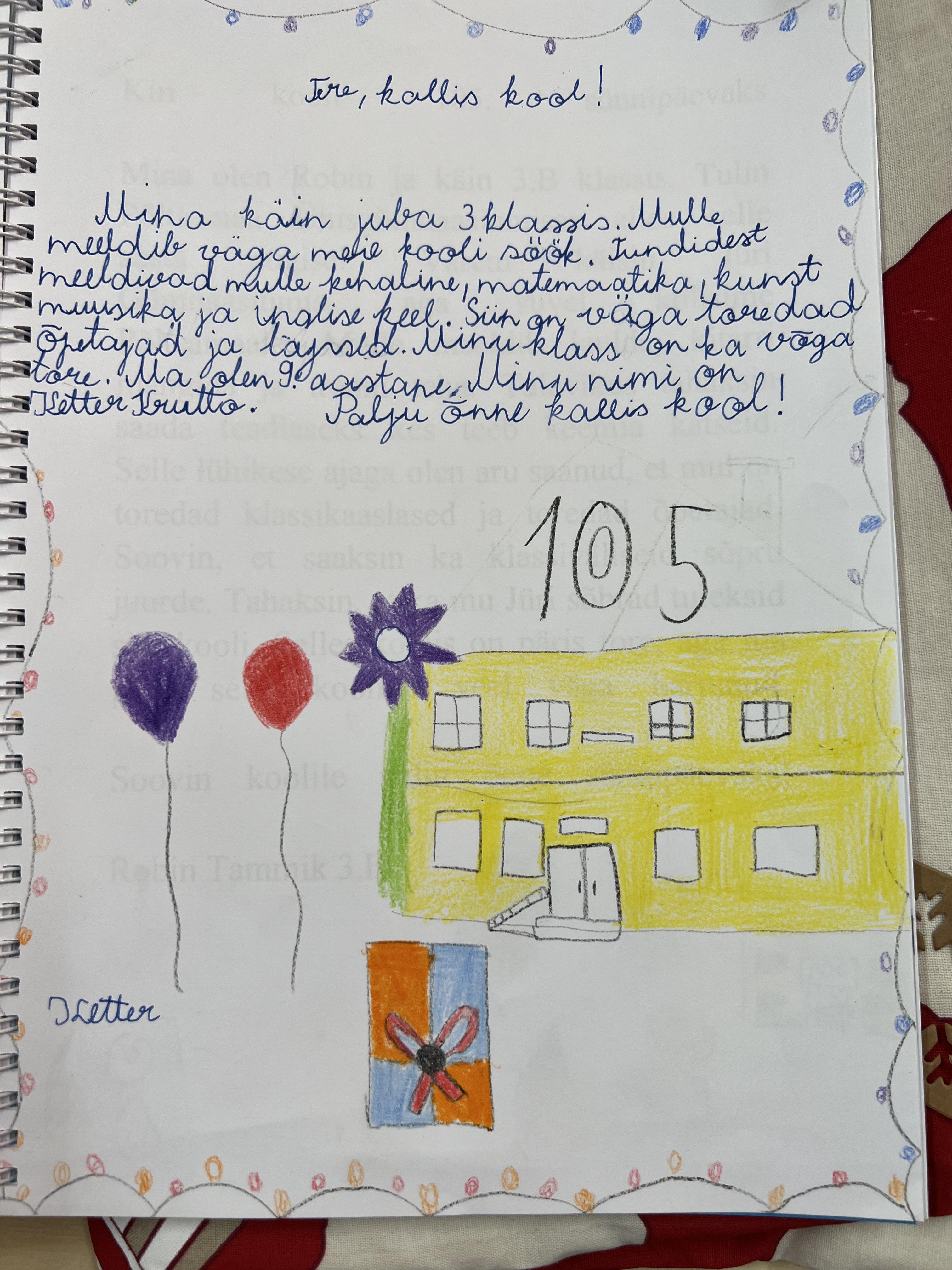 Kingituste tegemisel said õpilased ja õpetajad rakendada oma loovust ning jätsid killukese endast kooli ajalukku. Kooli 105. sünnipäeva puhul valmisid kingitustena näiteks matemaatika töölehed, õpilaste kirjutatud luuletused ja lood, piparkoogid kaasõpilastele, kommidest kujundatud 105, õpilaste fotodega 2023. aasta kalender, heade mõtete purk, õpilaste 105 käejäljest moodustatud kuusepuu kujutis koos heade soovidega (Lustivere õppekoht), soovide puu 105 (Adavere õppekoha soovid avanevad vaataja nutitelefonis, sest on peidetud QR koodi abil), fotokollaaž kooli sündmustest ja 105 kirjutusvahendit.