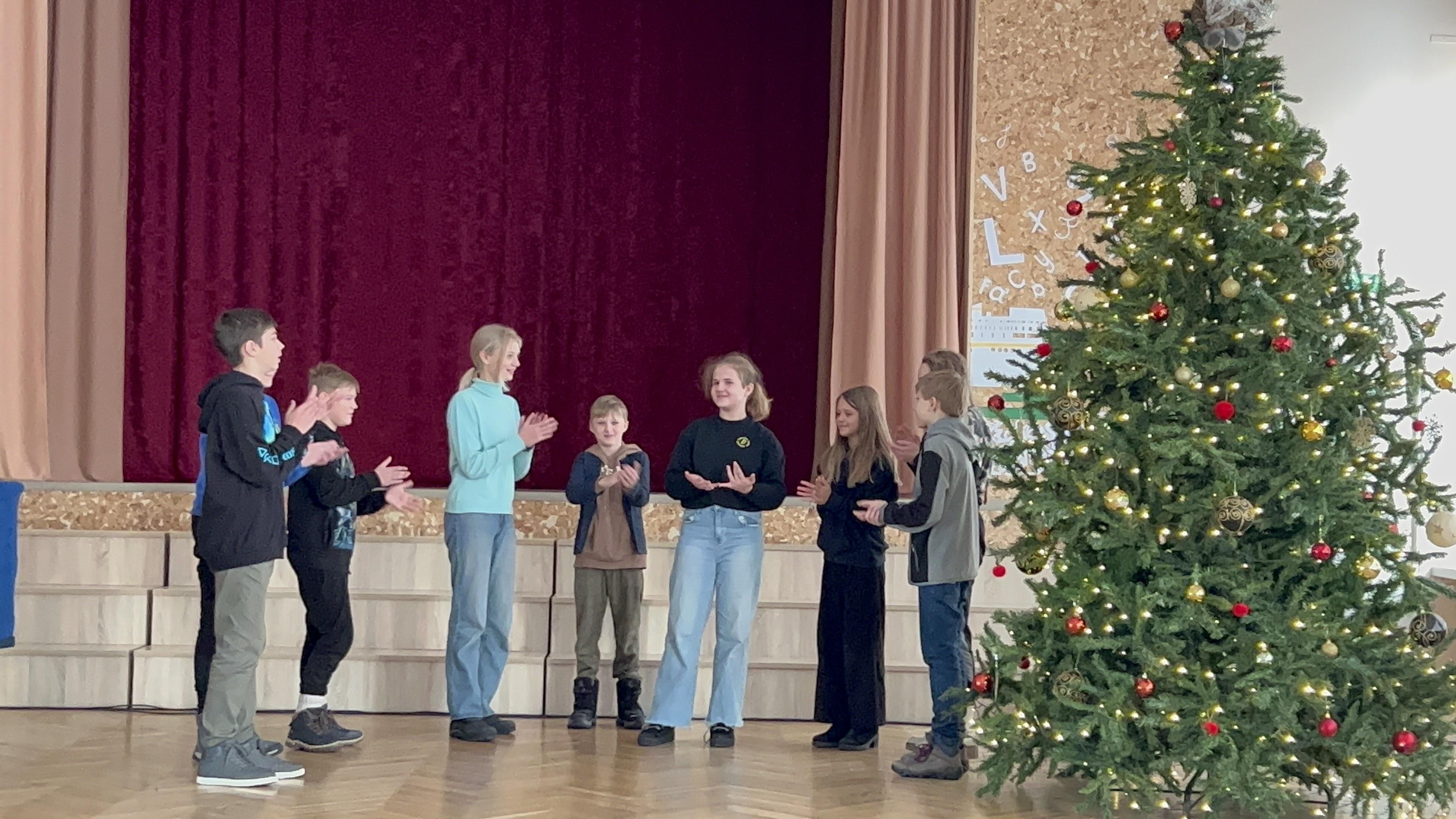 Projektikohtumine lõppes rahvusvahelistes tiimides loodud lühinäidendite esmaettekannetega kohaliku kooli aulas. Näidendites kajastusid nii jõulud kui ka muud teemad.