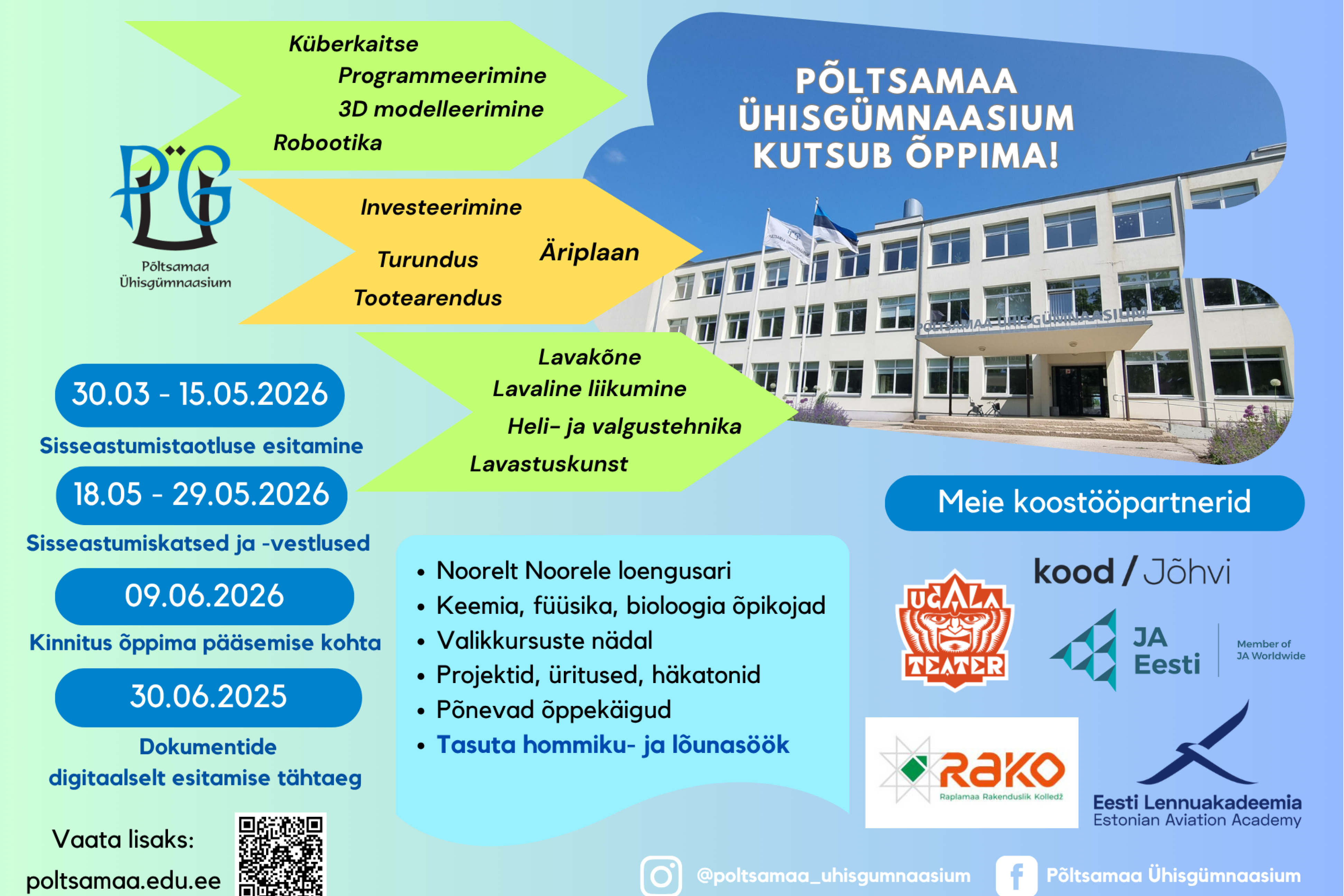 Pakkumiskutse põhikooli logole Loomise kuupäev 10.03.2026 Autor Jaanika Pärn Avatud uste päevad uutele gümnasistidele Loomise kuupäev 10.03.2026 Autor Janel Palm Rahvas soovib põhikooli nimeks Põltsamaa Põhikool Loomise kuupäev 03.03.2026 Autor Jaanika Pärn Eesti haridustöötajate traditsiooniline võrkpalliturniir 2026 Loomise kuupäev 25.02.2026 Autor Jaanika Pärn Vaata rohkem
