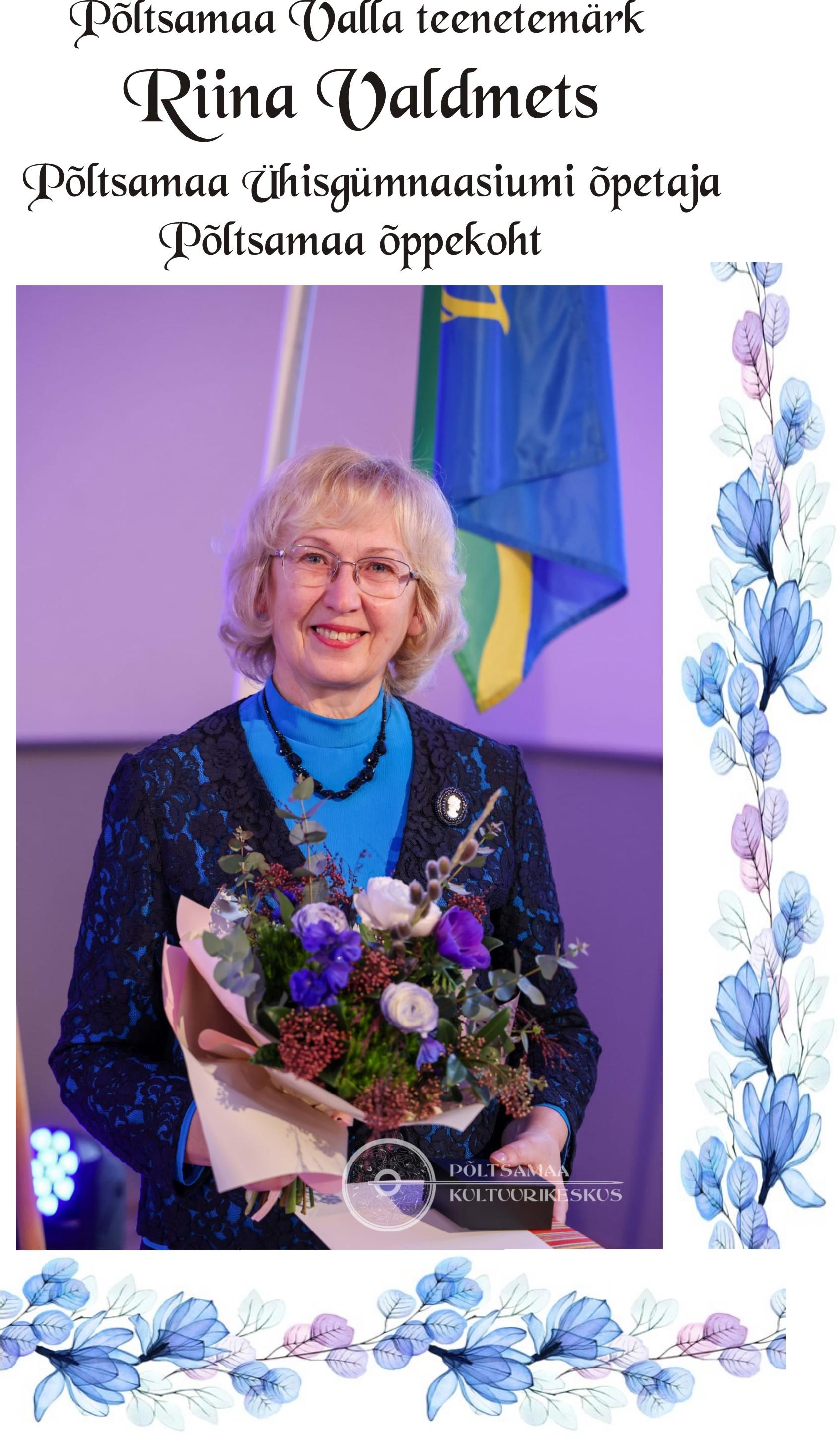 Pikaajalise silmapaistva töö eest hariduse väärtustamisel Põltsamaa Ühisgümnaasiumis tunnustas Põltsamaa vald teenetemärgiga Riina Valdmetsa.