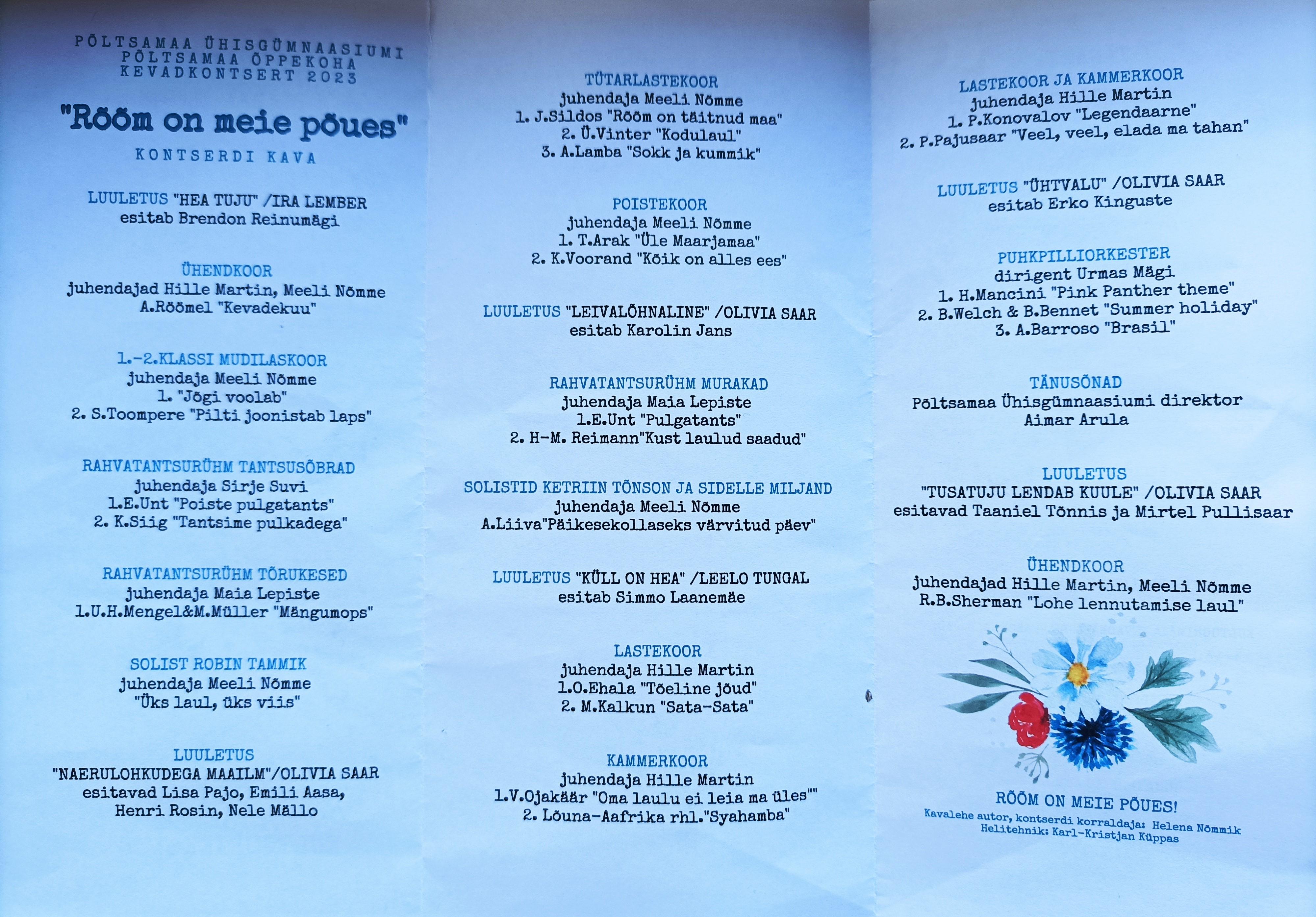 Meeli Nõmme ütles, et tütarlaste-, poiste- ja lastekoor esitasid tänavusel kontserdil laulupeo repertuaari. „Mudilaskoori laulud valisime peo pealkirja järgi. Lähtusime sellest, mida laps vajab ja mis talle rõõmu teevad: kevad, tore lapsepõlv, ema ja isa.“