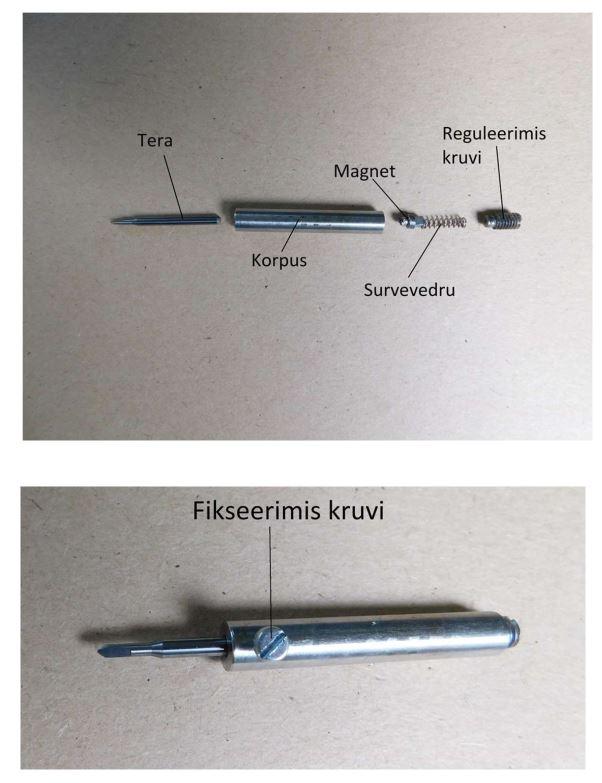 Lisalahendusena panin sinna magneti, mis hoidis ära tera väljakukkumise. Siis ei saanud ma aga reguleerida freesi lõikesügavust ning muster tuli liiga nõrk. Selle parandamiseks lisasin korpusele reguleerimiskruvi, millega saab suurendada või vähendada vedru survet.