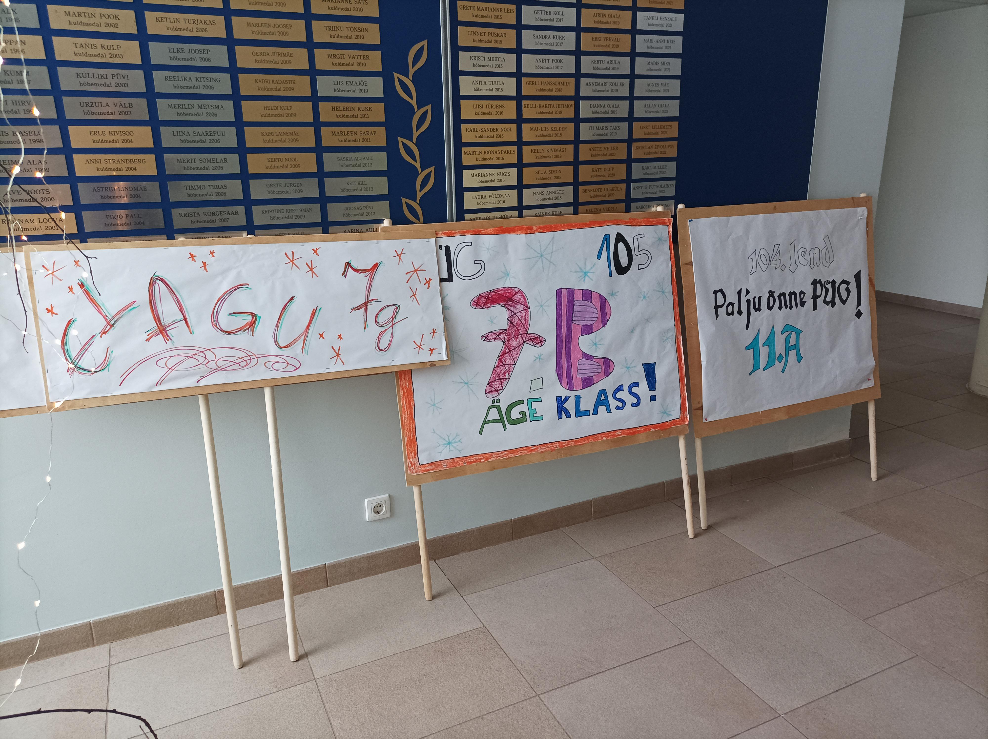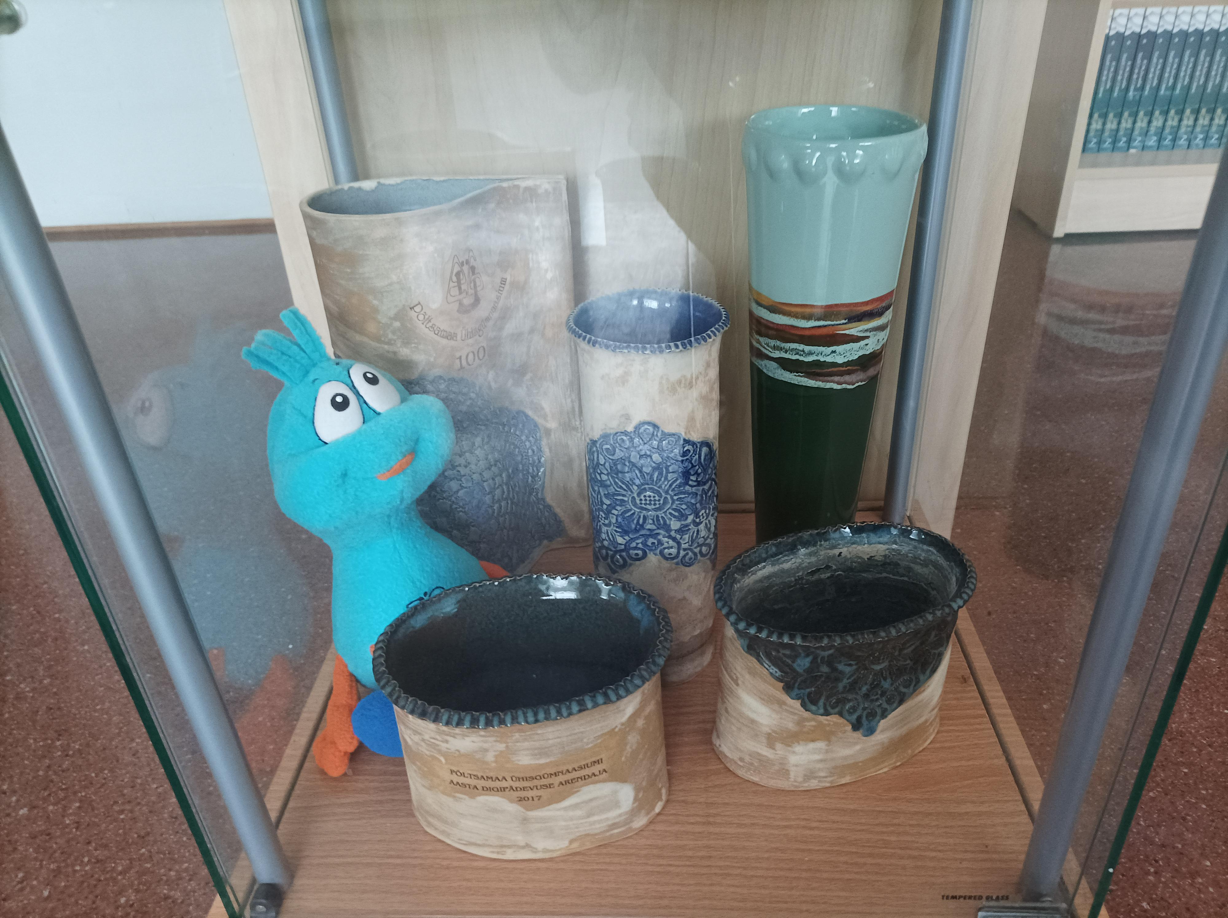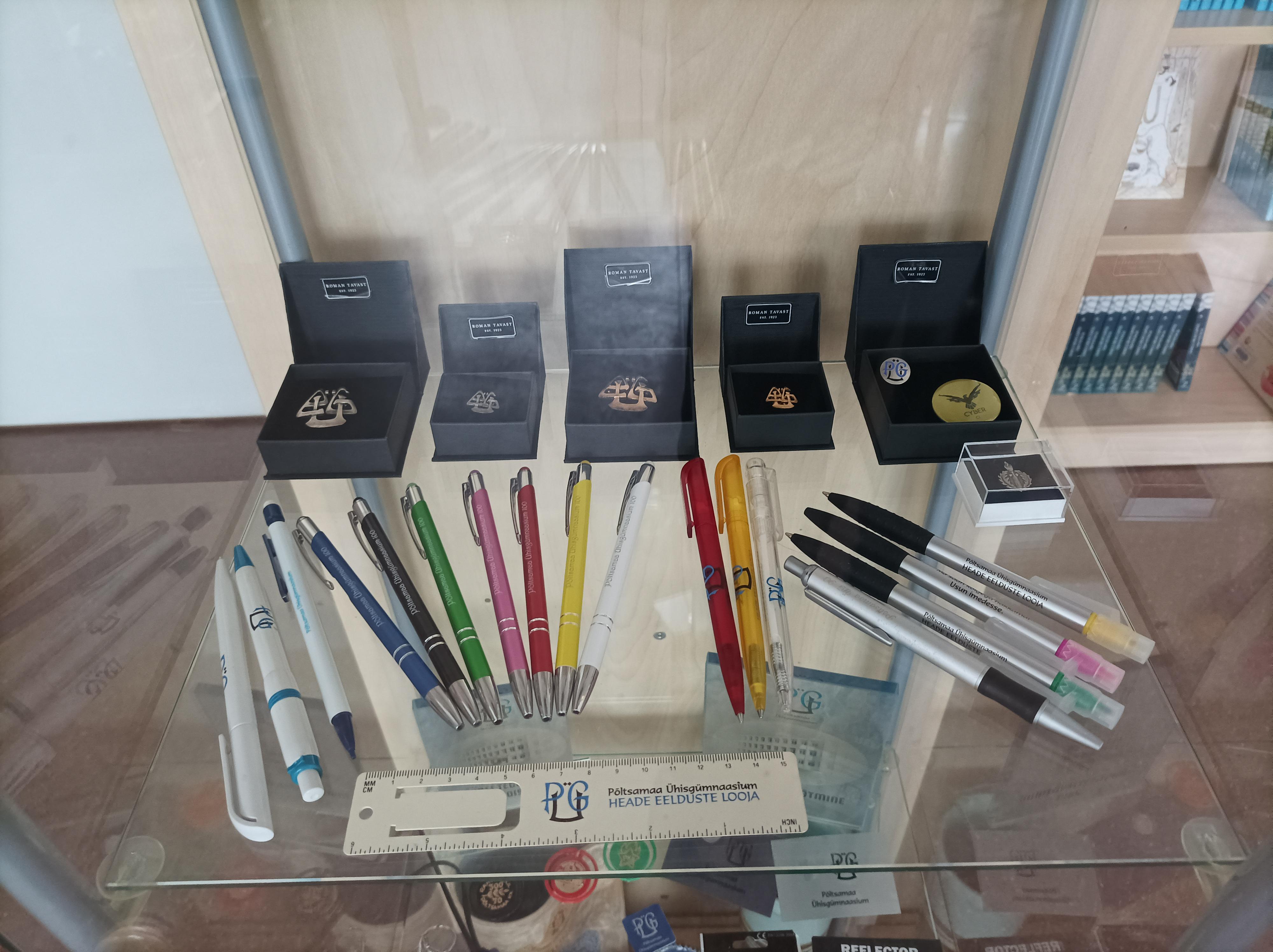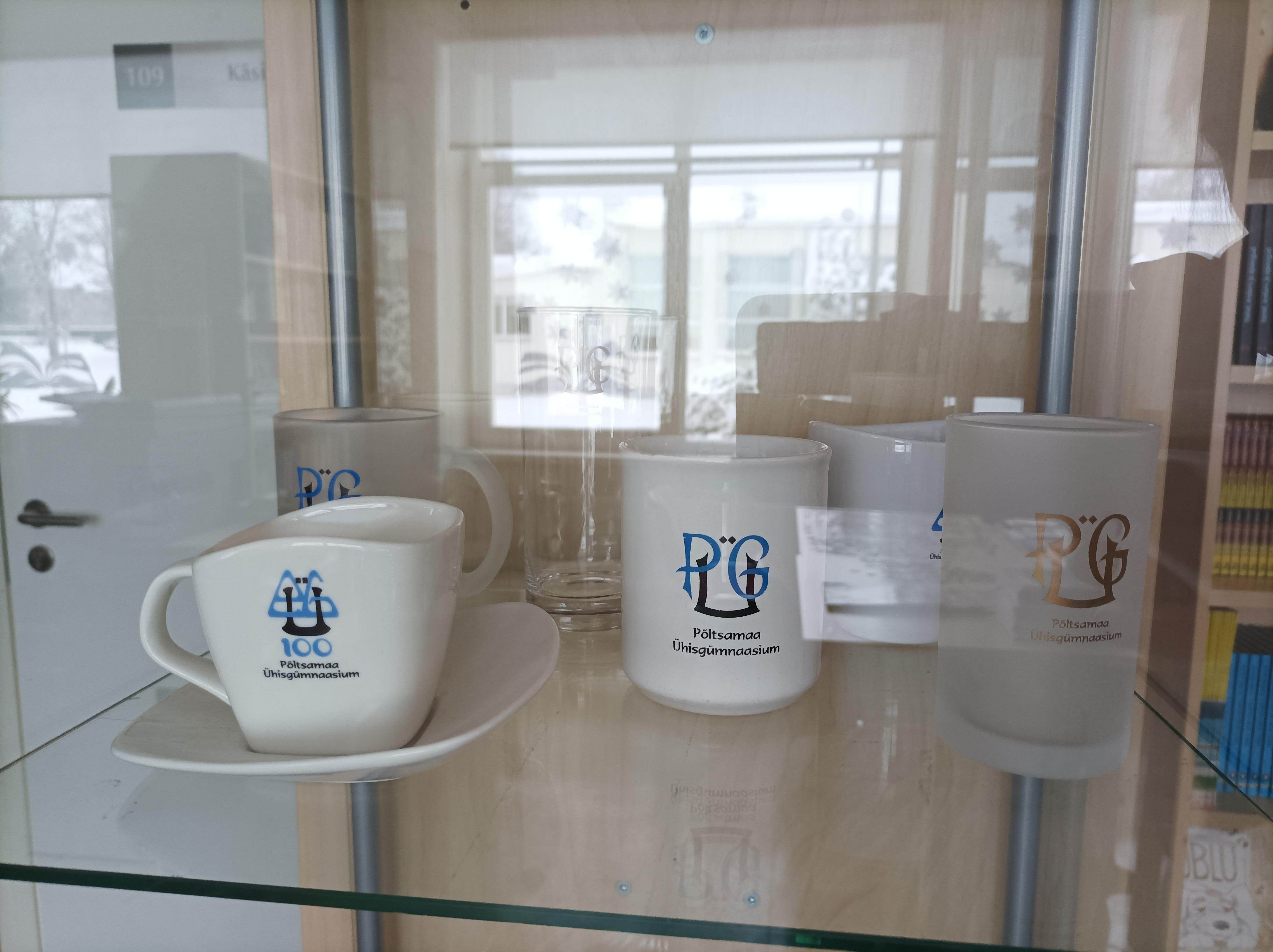Pidupäeva puhul oli ka kooli raamatukogus väljapanek PÜG logoga esemetest läbi aastate.