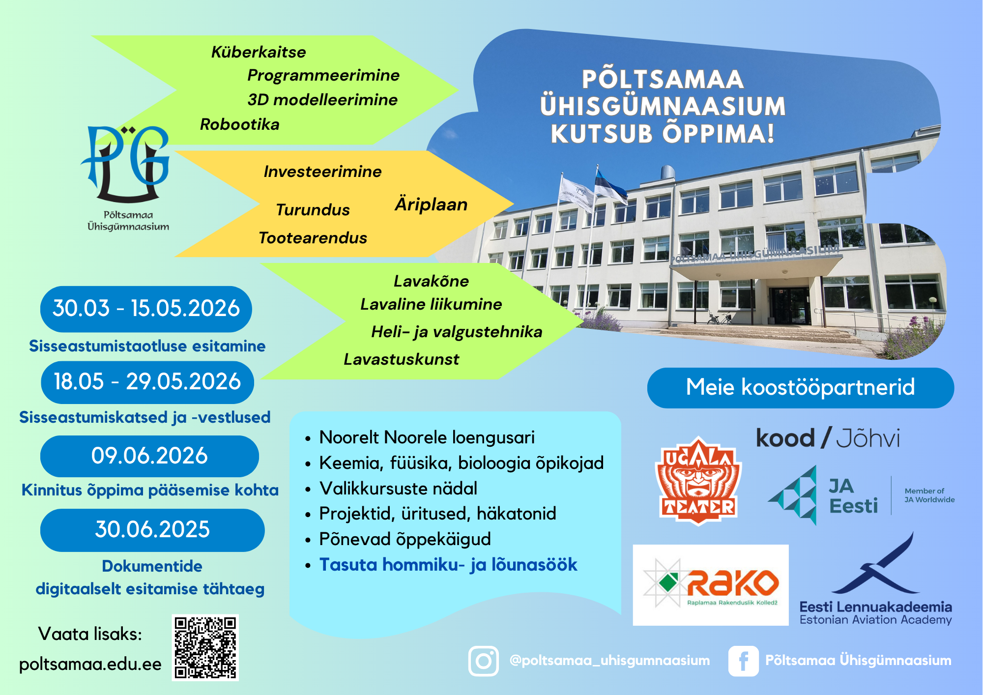 Pakkumiskutse põhikooli logole Loomise kuupäev 10.03.2026 Autor Jaanika Pärn Avatud uste päevad uutele gümnasistidele Loomise kuupäev 10.03.2026 Autor Janel Palm Rahvas soovib põhikooli nimeks Põltsamaa Põhikool Loomise kuupäev 03.03.2026 Autor Jaanika Pärn Eesti haridustöötajate traditsiooniline võrkpalliturniir 2026 Loomise kuupäev 25.02.2026 Autor Jaanika Pärn Vaata rohkem